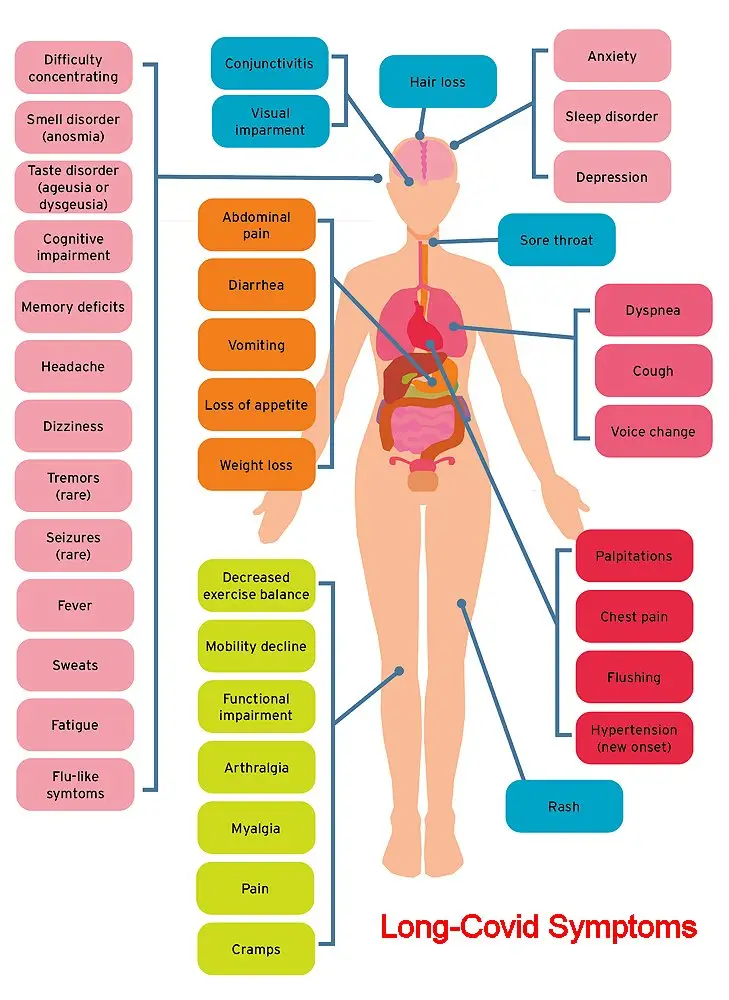 Long Covid, also known as long-haul covid, post-covid syndrome, and PASC (post-acute sequelae of covid) , is a systemic syndrome of over 200 symptoms (https://www.nih.gov/news-events/nih-research-matters/immune-hormonal-features-long-covid) affecting from 20% to possibly 50% of those who were infected with Covid-19. This illness is being studied intensely but is still not well understood and there are no definitive treatments. It can affect those who had covid-19 with no symptoms, mild symptoms, or life threatening symptoms. Some time after the initial infection various symptoms begin to emerge which can, in many cases, devastate a person’s life in many ways. Check out this YouTube channel for lots of good information: https://www.youtube.com/@LCCWYCD. This chart illustrates most of its possible effects. Symptoms vary for each person.
